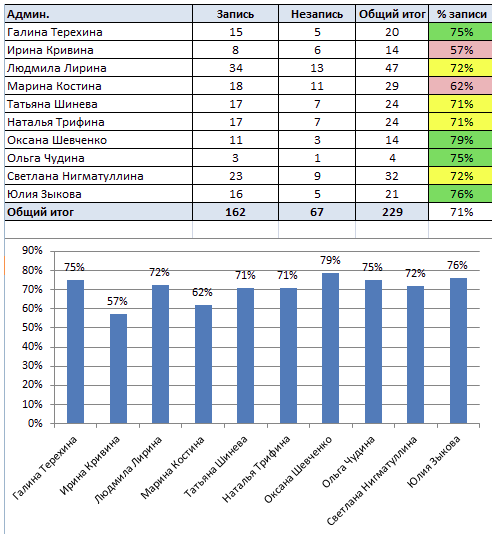 Для расчета показателей сравнивают итог первого месяца со средним итогом второго и третьего месяцев. Например, в первый месяц (сентябрь) на прием пришло 60% от общего числа принятых звонков от новых пациентов данным администратором. Если во втором и третьем месяцах (октябрь и ноябрь) на прием в среднем пришло уже 60%х1.35 =81% (или больше),то администратор получает бонус 5000 или 10000 р.