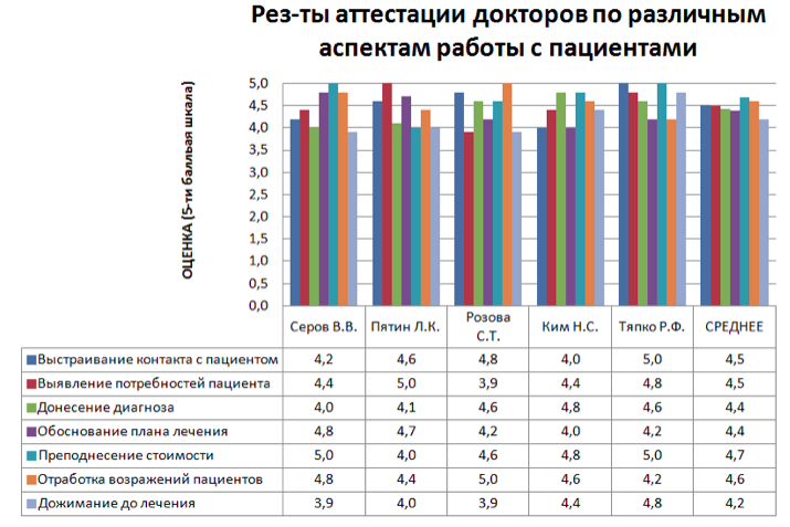 ● с 3.9 до 4.6 повысилась средняя оценка пациентами работы доктора (анкетирование по 5-балльной шкале)